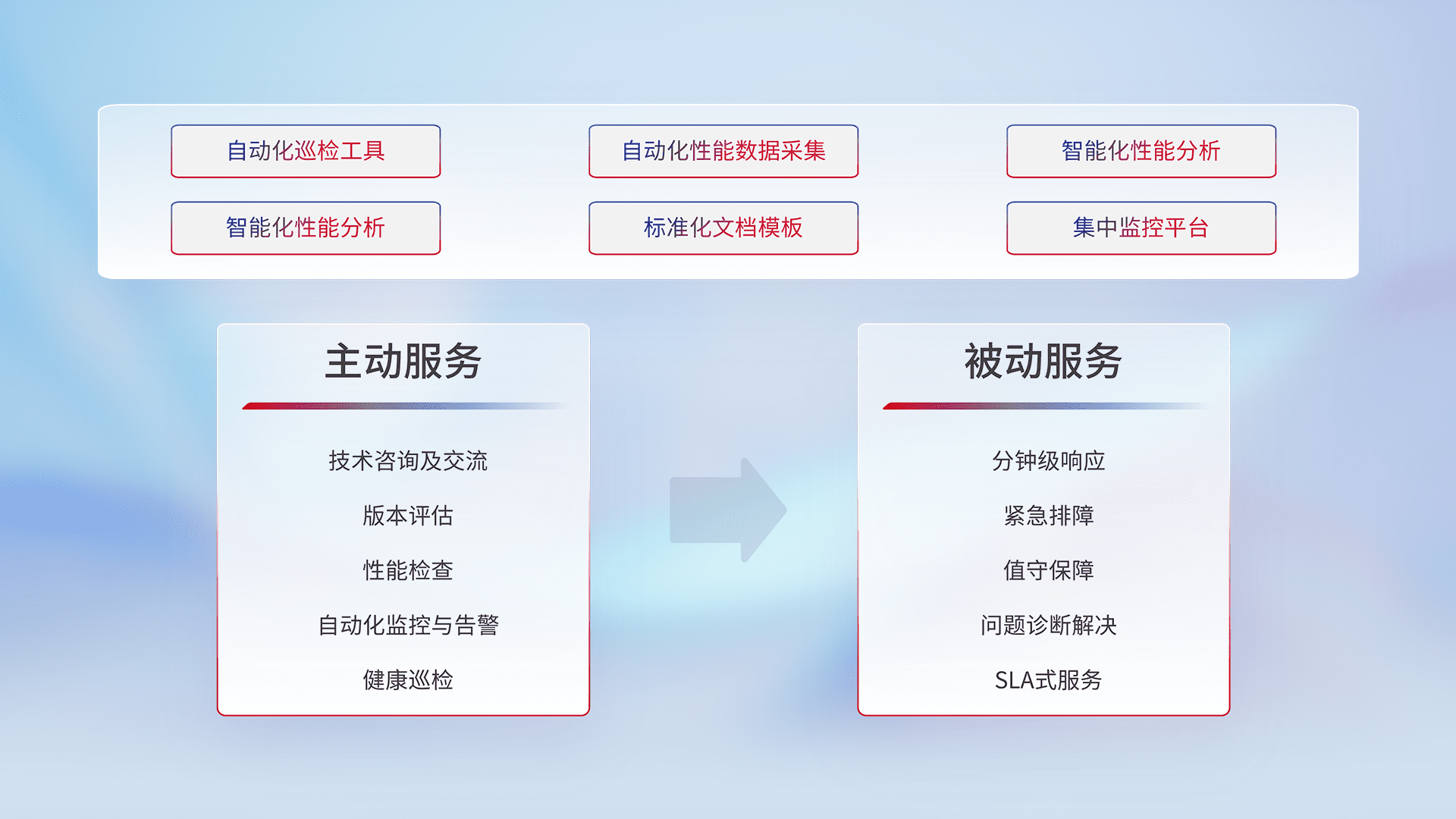 智能化工具和标准化文档,,保障服务质量,,提供主动服务(包含技术咨询、、、版本评估、、、、性能检查、、、、自动化监控与告警、、、、健康巡检)和被动服务包含(分钟级响应、、、紧急排障、、值守保障、、问题诊断解决、、、SLA服务)。。。。
